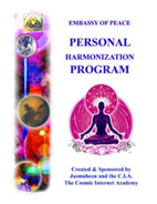 Personal Harmonization – this includes the Embassy’s Luscious Lifestyles Program PLUS additional personal finetuning data added in 2010. Basically those at the Embassy believe that each individual holds within them the perfect teacher who is all knowing, all loving; an inner guru who can guide us perfectly to achieve any proposed agenda that serves the whole. We also hold that this energy – in its purest expression – is the same force within us all as it gives us all life via our breath. Hence it is the one common factor that binds, wisely guides and also inspires us. We also propose that when this inner force is stimulated to express itself more powerfully within us, that it can then gracefully flow through us to unify our world. We stimulate this via our Personal Harmonization Program. The free e-book is offered to all who are interested in experiencing an increased level of personal health, happiness and harmony; and also to those who may identify themselves as Ambassadors of Peace or even Diplomats of Love, which are people who support the Embassy’s Programs.