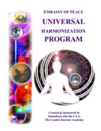 Universal Harmonization:- The Embassy of Peace with its Universal Harmonization Program:- This program is being offered so that people can be aware in a clear way of what will occur to our planet once we harmonize ourselves on both personal and global levels. Many metaphysicians know that what earth is going through is a very normal cycle in evolution that many planets have already undergone. In this section of our manual we do not wish to discuss the validity of the idea of life on other worlds – or planets that exists in the multi-verses – for there is enough scientific research now to attest to this possibility. Instead we wish to offer data to contemplate plus links to videos that you may wish to watch and a step by step pragmatic process for Universal Harmonization as it is said that Earth is rising through the dimensions to join more civilized realms. Let’s assume we all somehow magically get tuned to and experience the reality of personal and global harmonization as outlined in this manual, then what?